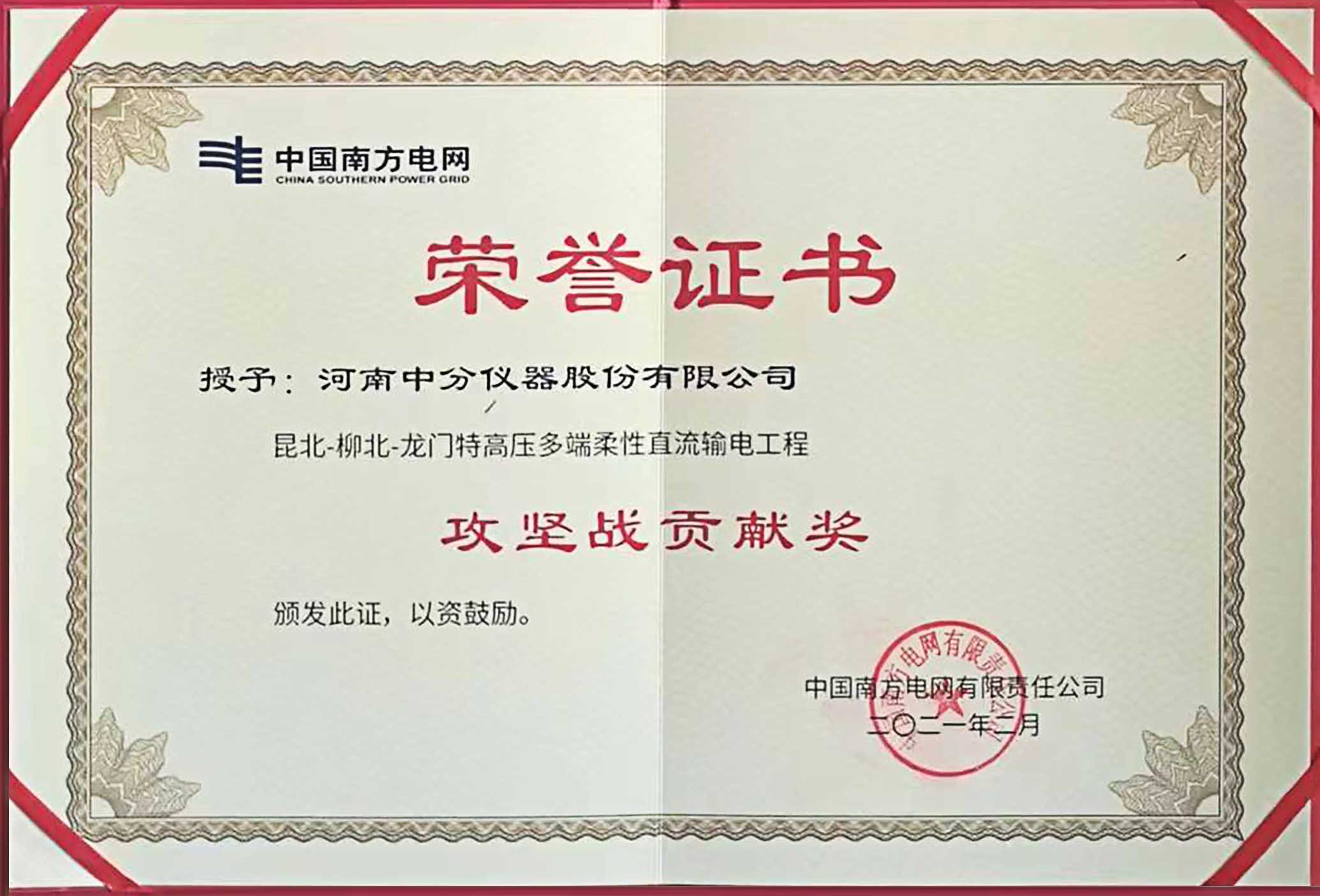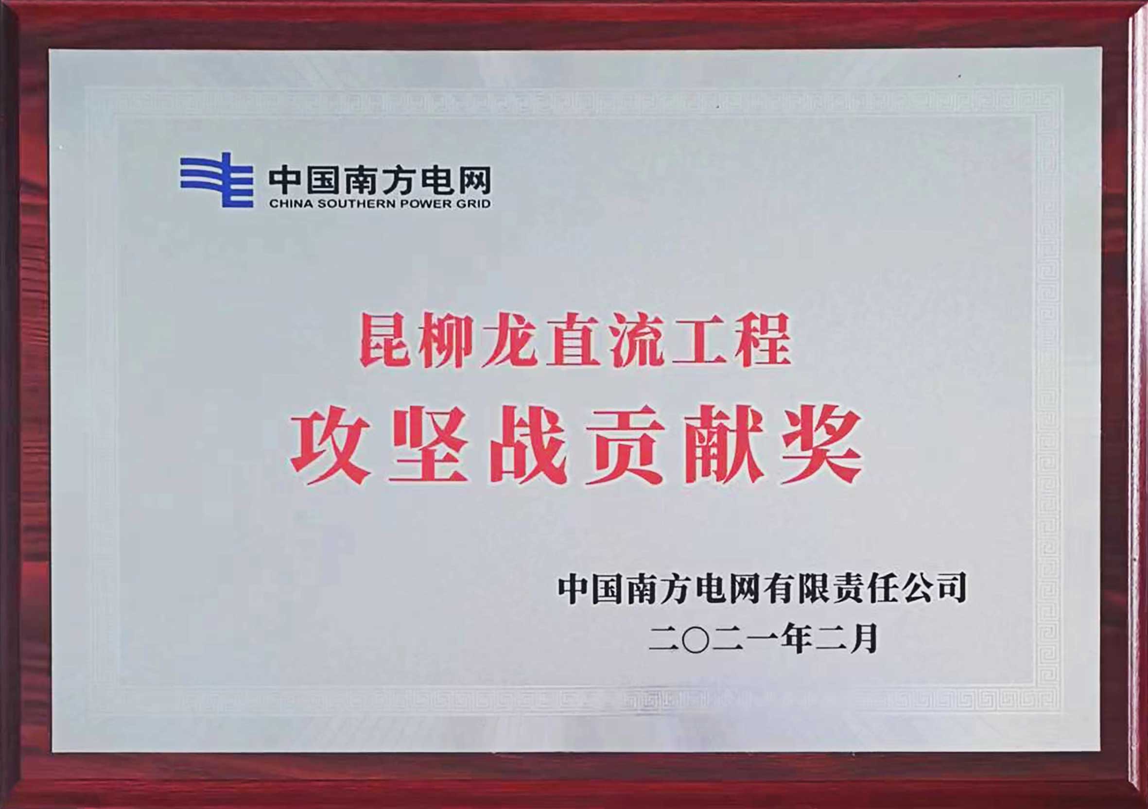 我公司在昆柳龍直流工程中獲得“攻堅戰貢獻獎”榮譽證書